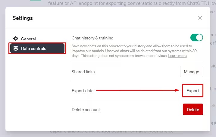 First, go to your Settings and Data Controls. You will find an option to “Export data”. This sends you a file of your chat history.